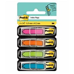 Úzke acetátové záložky do kníh, časopisov, ako register do cenníkov, kartoték, katalógov, zakladačov, archívov a pod. Priehľadná lepiaca čast a farebná časť na označenie.Prelepiteľné, znovunalepiteľné a popisovateľné. Rozmery záložky 11,9 x 43,1 mm. Dodávané v kombinácii 4 základných (červená,oranžová, modrá, žltá) alebo 4 neónových farieb )žltá, fialová, ružová. modrá) po 24 lístkov.Záložky s potlačou šípky upozorňujú na konkrétnu informáciu v texte. Šírka indexu 11,9 mm, v balení 4 farby po 24 lístkov.