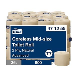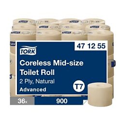 Systém dvojitého zásobníka Tork na bezdutinkový toaletný papier na kotúči je ideálny pre nízko až stredne frekventované toalety a umyvárne s vysokým dôrazom na spokojnosť zákazníkov. Zabezpečuje vysokú účinnosť a to, že toaletný papier je vždy k dispozícii pre hostí tým, že do neho možno vložiť dva celé kotúče strednej veľkosti. Tork Mid-Size bezdutinkový toaletný papier v kotúči Advanced predstavuje rovnováhu medzi cenou a funkčnosťou. Hygienický papier je vyrobený zo 100 % recyklovaných vláken.