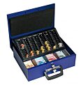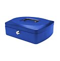 Uzamykateľná pokladnička s tvarovaným úchytom, plastovou priehradkou na mince a 2 kľúčami. Materiál pevná oceľ. Rozmery 325 × 85 × 235 mm. Farba modrá.