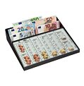 Samostatná mincová priehradka z tvrdého plastu, rozmerovo vhodná do bežnej stolovej zásuvky. Osem oddielov na eurá a centy v maximálnej hodnote 233,90 Euro, priehradka na bankovky, poukážky