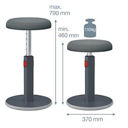 Ergonomická stolička Leitz Ergo umožňuje flexibilný pohyb medzi sedením a státím pri práci, podporuje pohyb svalov, zlepšuje držanie tela a zvyšuje hladinu energie. Má zaoblenú základňu, ktorá podporuje aktívny pohyb otáčaním a hojdaním. Pri práci zároveň posilňujete chrbtové svaly. Výšku možno ľahko nastaviť v rozmedzí 46-79 cm, stolička zostáva pevná a stabilná v akejkoľvek výške. Stolička je pohodlná a praktická, má sedadlo z priedušnej 3D peny potiahnuté vzdušnou sieťovinou protišmykovú základňu, ktorá nepoškodí podlahu. Maximálna nosnosť: 110 kg. Farba sivá.