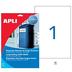 Biele etikety so štvorcovými rohmi, rozmer 210,0 x 297,0 mm s permanentným lepidlom. Balenie s 20 hárkami (20 štítkov). Etikety s bielym polyesterovým matným povrchom, odolné voči poveternostným vplyvom a vplyvom prostredia. Tieto polyesterové etikety odolávajú extrémnym podmienkam, teplotám od -20°C do +100°C. Ideálne na označovanie vonkajších prvkov a značiek, ako aj balíkov. Vynikajúca kvalita pri použití laserových tlačiarní aj kopírok.