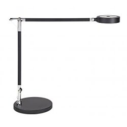 Atraktívna dizajnová stolná lampa energeticky úspornej triedy „A“ (spektrá A++ - E) s najnovšou technológiou LED. 24 LED žiaroviek s teplým bielym svetlom (3 000 °K) a 24 LED žiaroviek s bielym denným svetlom (6 000 °K) so životnosťou cez 20 000 hodín bez možnosti ich výmeny. Pohodlné ovládacie tlačidlá s dotykovou funkciou na hlavici s plynulým nastavením teploty farby, nastavenie osvetlenia pomocou stmievača v 4 krokoch. Svietivosť lampy 1 400 lx pri vzdialenosti 35 cm od stola, svetelný tok 300 lúmenov, nízka spotreba energie 6 kWh / 1 000 h. Plastová hlavica priemeru 11,6 cm s hliníkovou vložkou sa dá ľahko otočiť a nakloniť, stabilná základňa priemeru 20,5 cm má závažie a podložku na ochranu stola. Dĺžka brúsených eloxovaných hliníkových ramien 36,5 cm, výška normálnej pracovnej pozície 44 cm. Farba čierna.