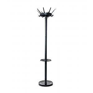 Vysokokvalitný oceľový vešiak je obzvlášť vhodný do prevádzok s vysokou premávkou, ako sú verejné priestory, úrady a pod. Robustný a elegantný oceľový stĺpik s matným čiernym práškovým náterom, ťažký betónový podklad potiahnutý plastom na zabezpečenie mimoriadnej stability. Matný povrch odolný proti poškriabaniu dáždnikom, 8 vešiakov na klobúky a 16 na kabáty z odolného ABS plastu, 4 prídavné plastové háčiky pod vešiakmi a 4 háčiky na stojane na dáždniky, stojan