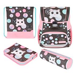 Školská taška s výbavou, ergonomicky tvarovaným a priedušným polstrovaním chrbta, nastaviteľnými ramennými popruhmi, výškovo nastaviteľným hrudným pásom, hlavným vreckom s priestorom na knihy, bočnými vreckami s elastickými pásikmi, predným vreckom na zips, stabilnou spodnou doskou s nožičkami, pohodlnou rukoväťou a reflexnými prvkami Oralite. Hmotnosť 950 g, objem 16 l, rozmery 37 x 31 x 22 cm. Vode-odolná, bez PVC, výbava: peračník, vrecko na prezuvky, okrúhle puzdro. Certifikát ergonómie 2023 a 2025. Materiál: polyester.