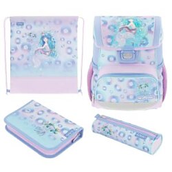 Školská taška s výbavou, ergonomicky tvarovaným a priedušným polstrovaním chrbta, nastaviteľnými ramennými popruhmi, výškovo nastaviteľným hrudným pásom, hlavným vreckom s priestorom na knihy, bočnými vreckami s elastickými pásikmi, predným vreckom na zips, stabilnou spodnou doskou s nožičkami, pohodlnou rukoväťou a reflexnými prvkami Oralite. Hmotnosť 950 g, objem 16 l, rozmery 37 x 31 x 22 cm. Vode-odolná, bez PVC, výbava: peračník, vrecko na prezuvky, okrúhle puzdro. Certifikát ergonómie 2023 a 2025. Materiál: polyester.