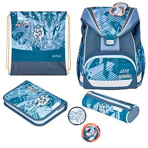 Školská taška s výbavou, s anatomicky tvarovaným polstrovaným a priedušným chrbtom, nastaviteľnými ramennými popruhmi, predným vreckom na zips, dvomi bočnými vreckami s elastickými pásikmi, stabilnou spodná doskou s nožičkami, pohodlnou rukoväťou, reflexnými prvkami Oralite, zatváranie Click lock zips, 1 x odnímateľný odznačik na suchý zips, 1 x dekoratívny prvok. Hmotnosť 800 g, objem 22 l, rozmery: 39 x 32 x 25 cm. Vode-odolná, bez PVC, výbava: peračník prázdny 2 chlopne, vrecko na prezuvky, oválne puzdro.