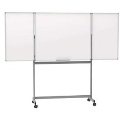 Veľká plocha na písanie na minimálnom priestore - 5 popisovateľných strán, dve vyklápateľné krídla. Povrch tabule z oceľového plechu s plastovou povrchovou úpravou, vhodný na časté používanie. Magneticky priľnavé, popisovateľné a stierateľné nasucho. Profil rámu tabule zo strieborného eloxovaného hliníka. Mobilná vďaka štyrom veľkým dvojitým otočným kolieskam s ľahkým chodom, s možnosťou zaistenia. Kovová odkladacia miska, ktorú možno vysunúť smerom nadol. Dvojitá pracovná plocha, biela tabuľa na oboch stranách.