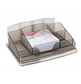 Priehľadný organizér na stôl na písacie potreby a drobné kancelárske potreby s poznámkovou kockou. Výška 14 cm. Farba dymová.