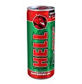 Letná chuť HELL STRONG WATERMELON s príchuťou vodného melónu, o 20 % viac kofeínu namiesto 32 mg / 100 ml, bez konzervantov, s prídavkom 5 druhov vitamínov B, v nekonečne recyklovateľnom ob
