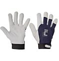 Rukavice šité z jemnej lícovej kozinky a lícovej ovčinky v dlani, modrej bavlnenej tkaniny na chrbte a s manžetou na suchý zips.Palm material: ovčia lícová kožaMateriál manžety: guma, vel