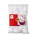 Biele polystyrénové gule. Každé vrecko obsahuje 100 guličiek v rôznych veľkostiach: Ø 60 mm (10 kusov), Ø 50 mm (10 kusov), Ø 35 mm (15 kusov), Ø 25 mm (25 kusov), Ø 20 mm (25 kusov) a Ø