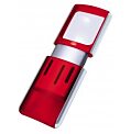 Lupa s podsvietením. Veľkosť cca 35×38 mm, 3-násobné zväčšenie. 2 batérie 3V sú súčasťou balenia.Farba: červená