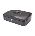 Uzamykateľná pokladnička s tvarovaným úchytom, plastovou priehradkou na mince a 2 kľúčami. Materiál pevná oceľ. Rozmery325 × 85 × 235 mm. Farba čierna.