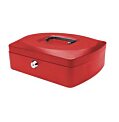 Uzamykateľná pokladnička s tvarovaným úchytom, plastovou priehradkou na mince a 2 kľúčami. Materiál pevná oceľ. Rozmery 255 × 85 × 200 mm. Farba červená.