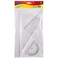 Sada plastických geometrických pomôcok, užitočná pre každého študenta. Mierka podľa noriem. Sada: pravítko 20 cm, uhlomer 10 cm, sada trojuholník 14 cm a 10 cm. Farba transparentná.