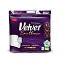 Toaletný papier Velvet Excellence sú veľké, ideálne navinuté rolky pevného papiera, ktorý sa skladá zo štyroch vrstiev mäkkého, jemného papiera. Jeho pevné, silné a snehovo biele útrž