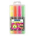 4 kusová sada mini zvýrazňovačov edding so zrezaným hrotom so šírkou stopy 1 - 3 mm. Neónový pigment s maximálnym jasom, protišmyková ergonomická rukoväť. Uzáver s klipom. Väčšie b